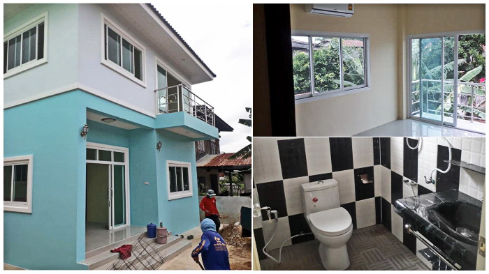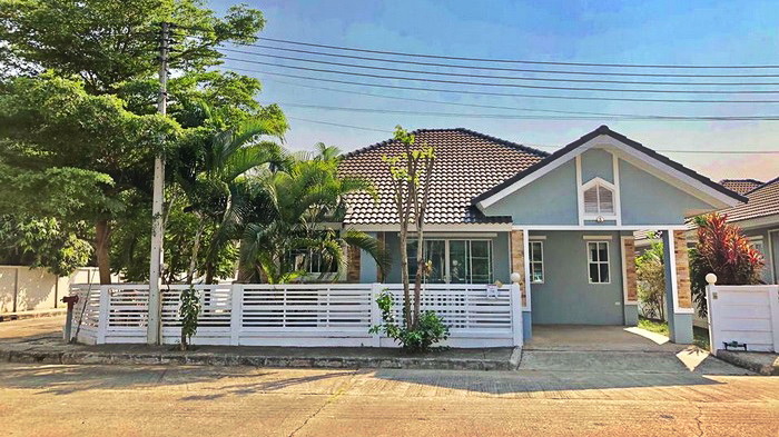 บ้านสไตล์โมเดิร์น ตกแต่งภายนอกในโทนสีฟ้าอ่อน ขนาด 2 ชั้น 3 ห้องนอน 2 ห้องน้ำ ราคา 1.55 ล้านบาท
