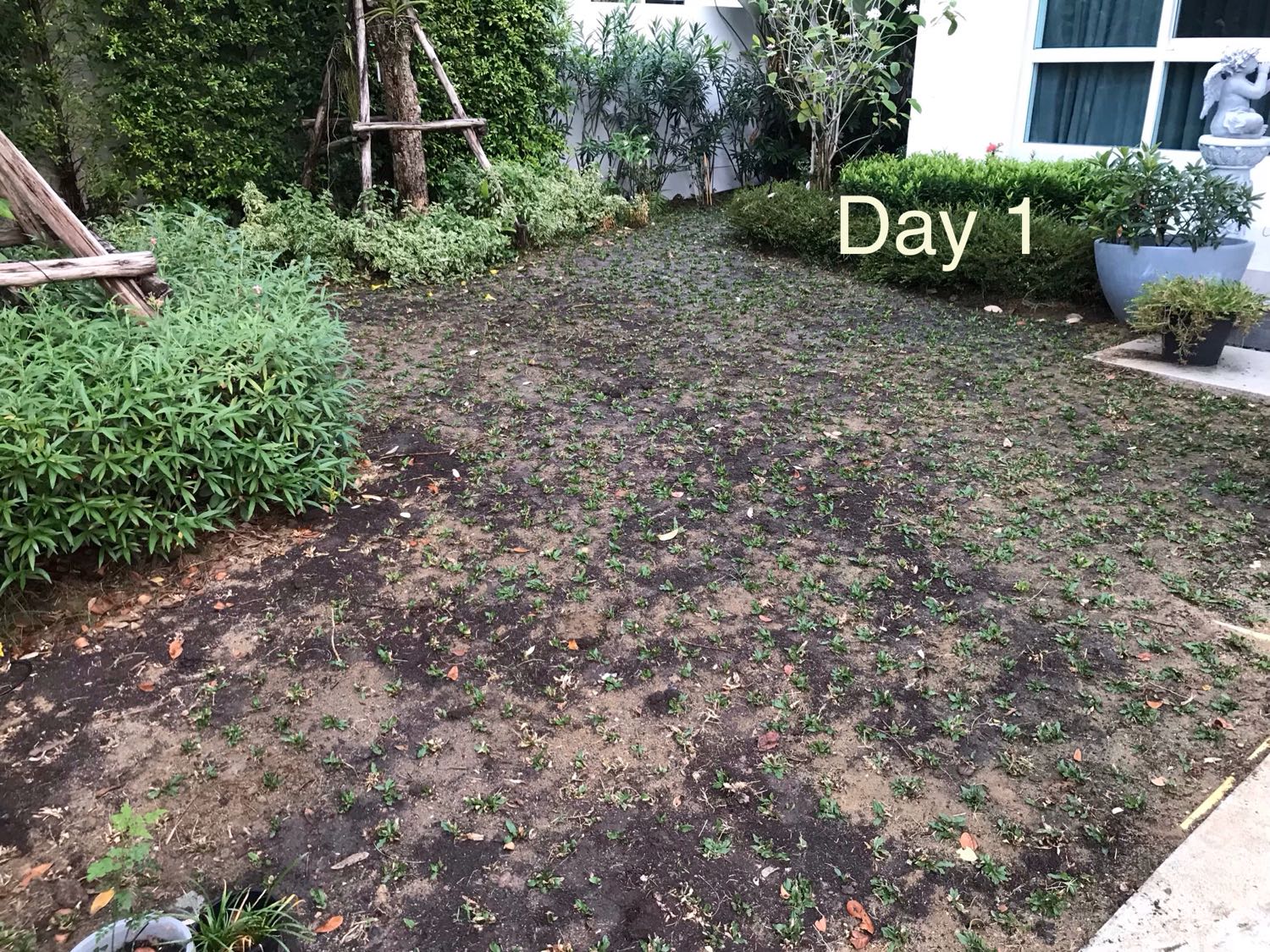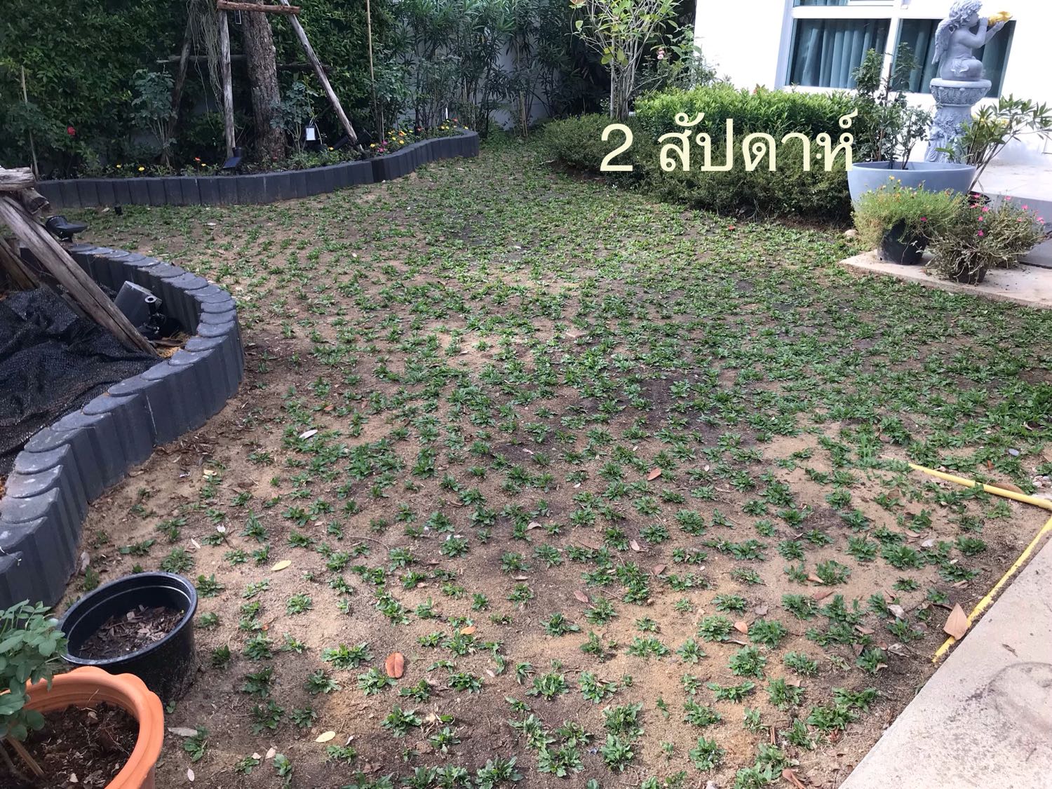 วันแรกที่เค้ามาปลูกให้ รวมถอนหญ้าเดิมด้วย ไม่ได้ปลูกเป็นแผ่นเหมือนหญ้าปกติ ต้องจิ้ม ๆ ห่างกัน 3 นิ้ว แล้วรอมันโตขยายไป
