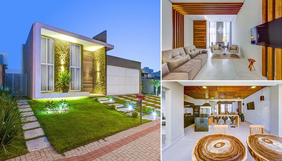 บ้านชั้นเดียวไตล์โมเดิร์น พร้อมพื้นที่สนามหญ้าหน้าบ้าน ภายนอกตกแต่งด้วยโทนสีที่เรียบง่าย เน้นการตกแต่งที่มีลักษณะและลวดลายที่เป็นธรรมชาติ เช่น ไม้และหิน ส่วนหน้าของบ้านติดตั้งหน้าต่างกระจกสูง ที่ให้ความโปร่งและแสงสว่างแก่ภายในบ้าน