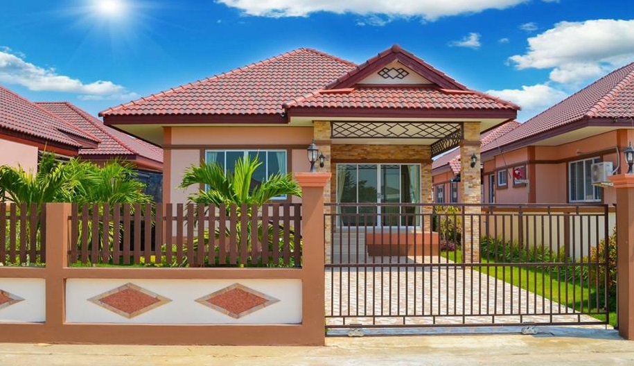 มาชมตัวบ้านกันเลยครับ ลักษณะบ้านชั้นเดียว โครงสร้างคอนกรีตเสริมเหล็ก หลังคามุงด้วยกระเบื้องลอนโทนสีแดงเด่น มาในทรงปั้นหยา ผสมรูปจั่วหลังคาที่ชายคา