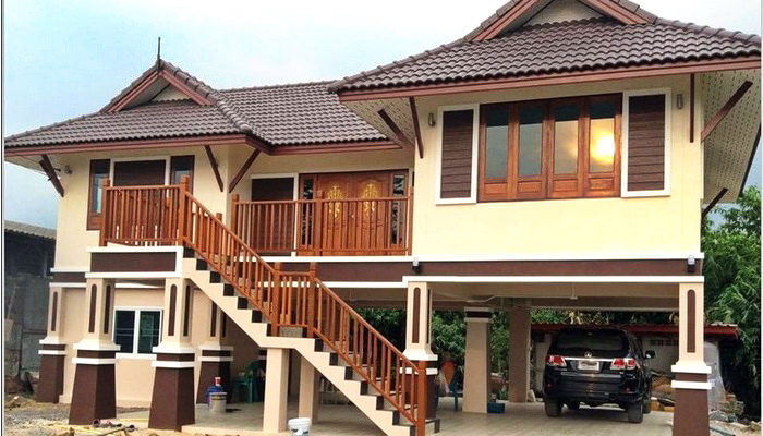 ผนังภายนอกใช้สีโทนอ่อน และแต่งสีน้ำตาลเข้ม ตัดกันได้อย่างลงตัว ใต้ถุนบ้านทำเป็นที่จอดรถในร่ม และจัดมุมพักผ่อน สามารถติดตั้งเปลญวนนอนเล่นได้อย่างสบายใจ