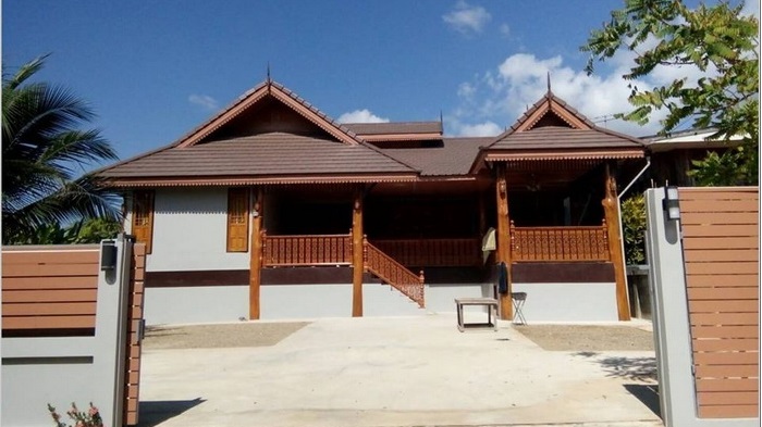 ตัวบ้านให้ความโดดเด่นด้วยเสาบ้านวัสดุจากไม้สักขนาดใหญ่ และรั้วไม้ฉลุลวดลายสวยงาม พร้อมตกแต่งชายคาด้วยงานไม้เก็บรายละเอียดอย่างสวยงาม