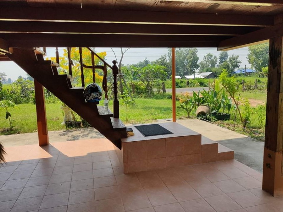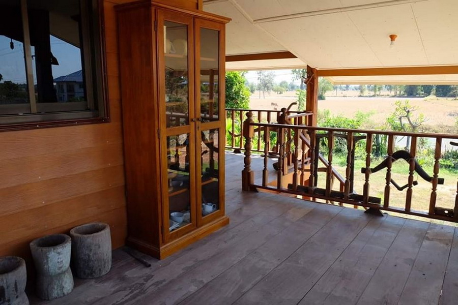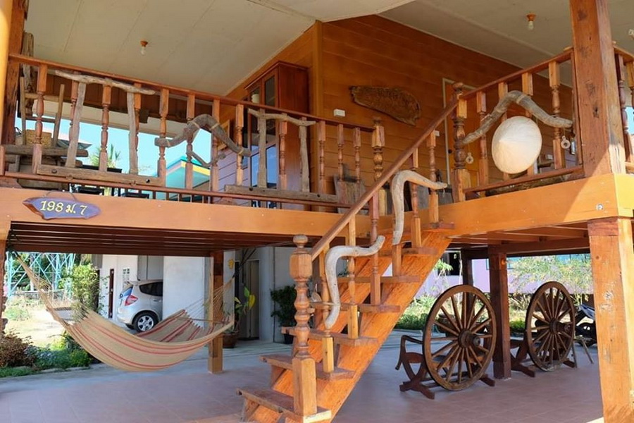 บันไดนำขึ้นสู่ด้านบนมีราวจับ ทำจากไม้แกะสลักตามแบบฉบับบ้านทรงไทย ส่วนพื้นปูด้วยไม้ให้ความสวยงามเป็นธรรมชาติ