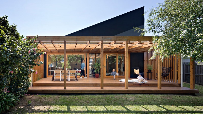 เริ่มจากภายนอกกันก่อนเลย ตกแต่งด้วยผนังไม้ฝาในโทนสีขาว หลังคาทรงจั่วผสมปั้นหยา มองจากภายนอกจะเห็นเป็นบ้านสไตล์คลาสสิคดั้งเดิมของประเทศออสเตรเลีย แต่แท้จริงแล้ว แอบซ่อนการตกแต่งที่สดใสสุดๆ ไว้ภายในอยู่ครับ