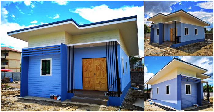การตกแต่งบ้านหลังนี้ ผนังภายนอกเลือกใช้โทนสีฟ้าอ่อนที่ให้บรรยากาศที่สดใส ส่วนฐานและขอบของบ้านเลือกใช้เฉดสีที่เข้มเพื่อป้องกันคราบสกปรก