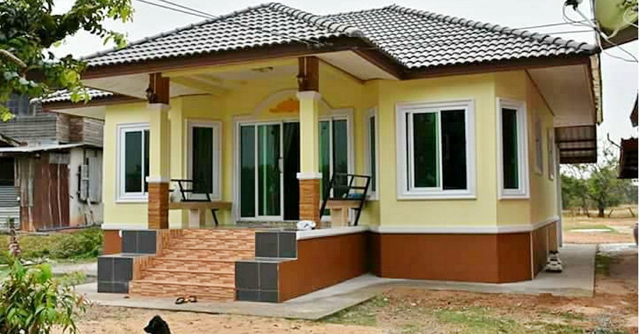ลักษณะบ้านชั้นเดียว ออกแบบในสไตล์คอนเทมโพรารี ตัวบ้านออกแบบยกพื้นสูง ผนังภายนอกตกแต่งด้วยโทนสีเหลืองอ่อน ตัวฐานเลือกใช้สีน้ำตาลเข้มเพื่อป้องกันคราบสกปรก หลังคาของบ้านเป็นหลังคาทรงปั้นหยามุงด้วยกระเบื้องลอนสีเข้ม