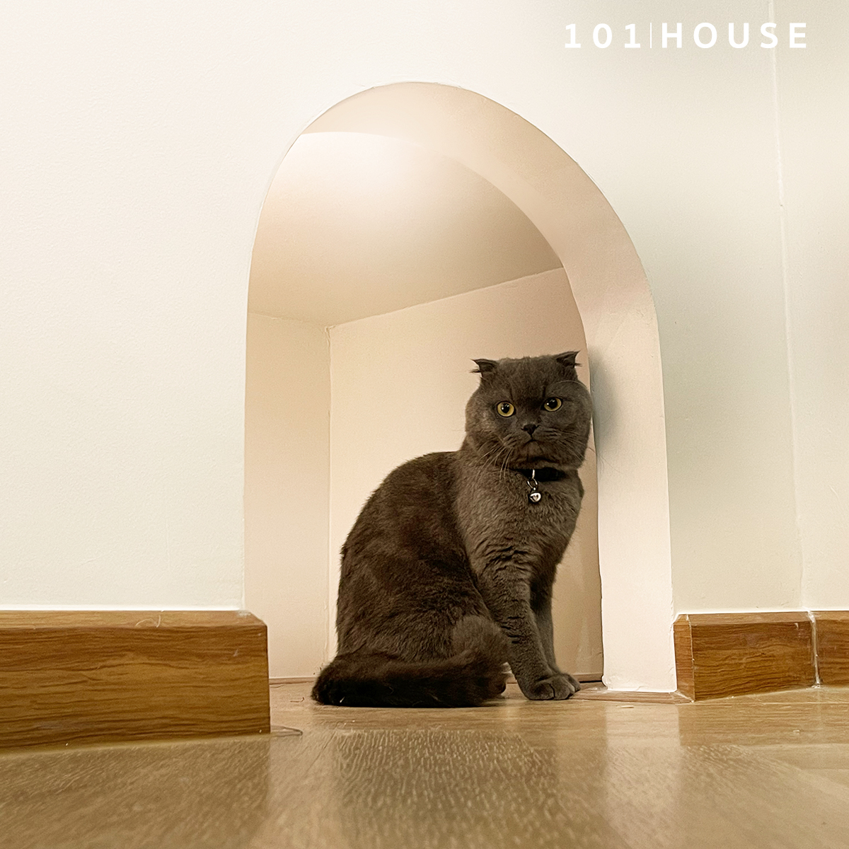 โดยการนำพื้นที่ส่วนใต้บันไดมาทำเป็นพื้นที่ส่วนตัวให้น้องแมว ดีไซน์ทางเข้าด้วยซุ้มโค้ง