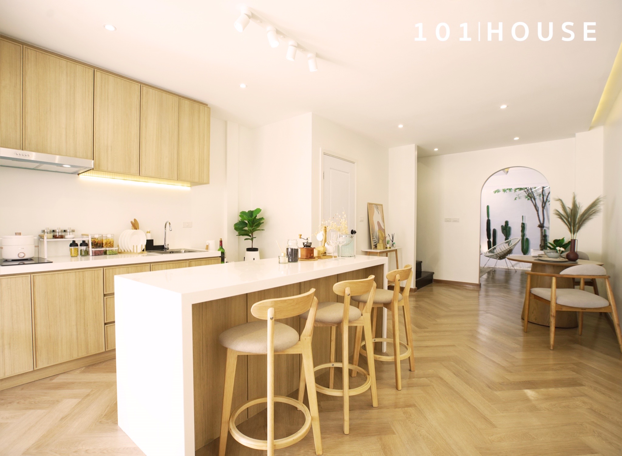 ภายในบ้านเน้นโทนสีไม้อ่อนสลับกับสีขาวเพื่อสร้างบรรยากาศภายในบ้านให้ดูอบอุ่นทั้งกลางวันและกลางคืน