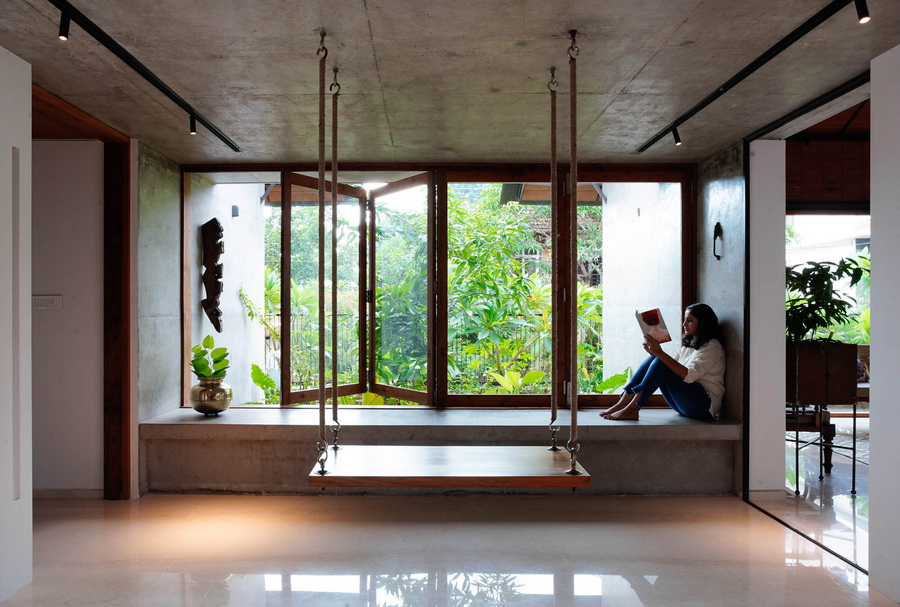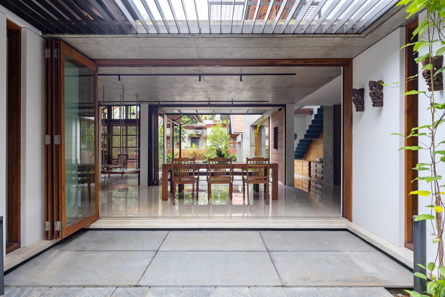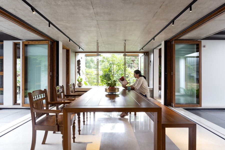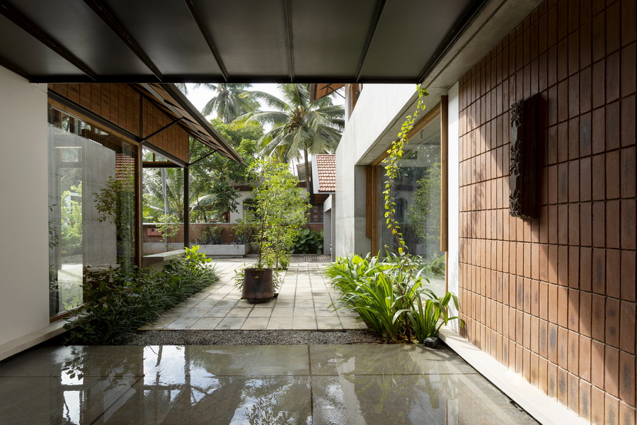 ตัวบ้านมีอาคารอยู่หลายหลัง โดยแต่ละอาคารจะมีพื้นที่หว่างระหว่างอาคารถูกตกแต่งด้วยต้นไม้ รวมไปถึงการเน้นความโปร่งสบายเพื่อให้อากาศถ่ายเทได้สะดวก