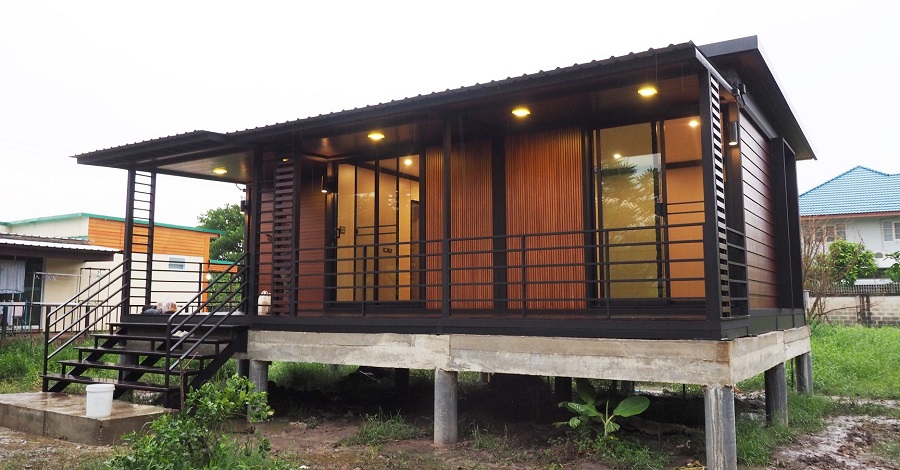 บ้านสไตล์โมเดิร์นลอฟท์ หลังนี้เป็นผลงานการออกแบบจาก BB-Home บ้านน็อคดาวน์ ดีไซน์ยกใต้ถุนเตี้ย เพื่อให้ลมโกรก และมีการเลือกใช้วัสดุอย่างไม้กับเหล็กสีดำเป็นหลักตัดกันได้อย่างโดดเด่น ส่วนหลังคาบ้านเป็นแบบเพิงหมาแหงนเท่ ซึ่งรับกับรูปทรงบ้านแบบหน้ากว้างได้ดีเยี่ยม