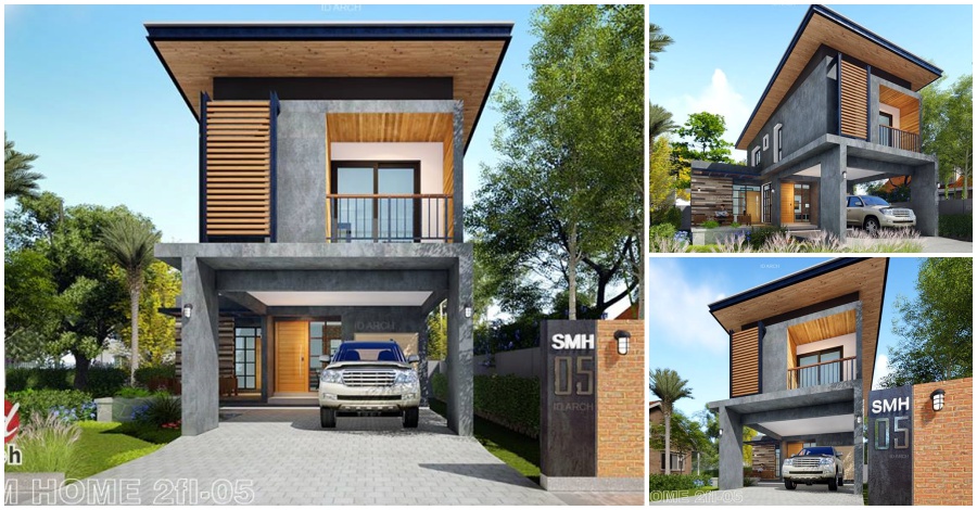 บ้านหลังนี้เป็นผลงานการออกแบบจาก Id Arch ดีไซน์บ้านสองชั้นโครงสร้างคอนกรีต ตัวบ้านออกแบบในรูปทรงเหลี่ยมสูงโปร่ง ภายนอกตกแต่งด้วยผนังปูนเปลือยขัดมัน เพิ่มลูกเล่นด้วยระแนงไม้สีอ่อน มุงหลังคาเมทัลชีททรงเพิงหมาแหงน