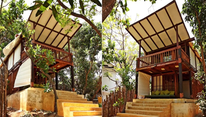 ออกแบบบ้านขนาดเล็กๆ ใช้โครงสร้างไม้ ออกแบบรูปทรงสี่เหลี่ยม เว้นพื้นหน้าบ้าน ยกพื้นสูง ไว้เป็นส่วนพักผ่อน ดูโปร่งเบาไปในตัว หลังคาออกแบบทรงเพิงหมาแหงน ชิ้นเล็กๆ เปิดรับหน้าบ้านให้โดดเด่น มาพร้อมเฉลียงหน้าบ้านและหลังบ้านในชั้นสอง