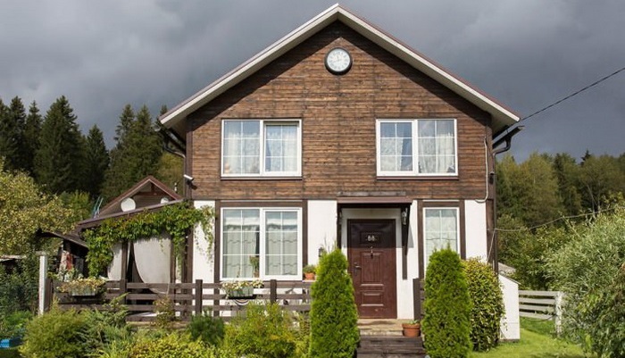 ลักษณะภายนอกของบ้าน เป็นบ้านไม้กึ่งปูน สองชั้น ผนังด้านล่างใช้สีขาวเรียบ แต่งขอบด้วยไม้สีน้ำตาลเข้ม เพื่อให้มีมิติ ส่วนชั้นบนผนังใช้ไม้ฝาสีเข้ม เรียงเกล็ดอย่างเป็นระเบียบ หลังคาทรงหน้าจั่ว น่าอยู่เป็นที่สุด