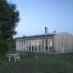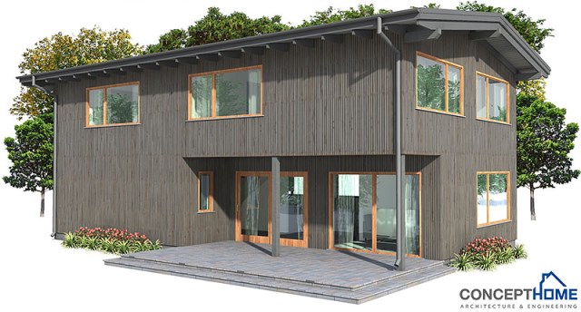 ตัวบ้านโครงสร้างคอนกรีต ตกแต่งด้วยผนังไม้ตีชิดในแนวตั้ง รูปทรงแปลนที่เรียบง่าย เว้นพื้นที่ชั้นล่างเป็นเฉลียงรองรับทางเข้าหน้าบ้านอีกด้วย