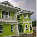 ลักษณะบ้านชั้นเดียว ผนังภายนอกตกแต่งด้วยไม้ฝาสีขาว หลังคาปูกระเบื้องสีดำดูเข้ากันกับตัวบ้าน เพิ่มมิติให้ตัวบ้านสวยสะดุดตาด้วยการใช้สีระแนงไม้และเสาสีน้ำเงิน สร้างความเก๋และ ความสวยงามได้อย่างลงตัว