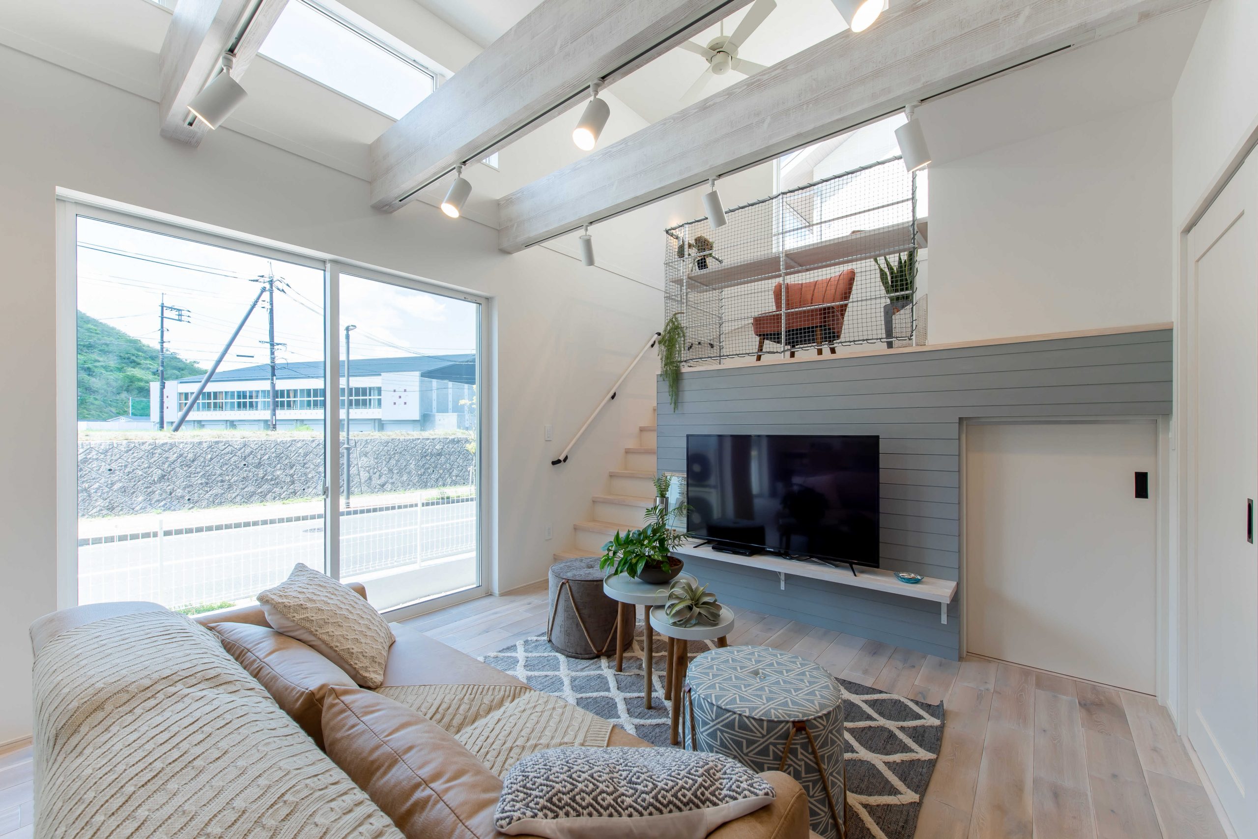 เมื่อเข้ามาภายในบ้าน เราก็จะมาอยู่กันที่ห้องโถงหลักของบ้านที่เป็นห้องนั่งเล่น ซึ่งตกแต่งในบรรยากาศที่เรียบง่าย เพดานแบบยกสูงยังช่วยให้ห้องปลอดโปร่งดีอีกด้วย