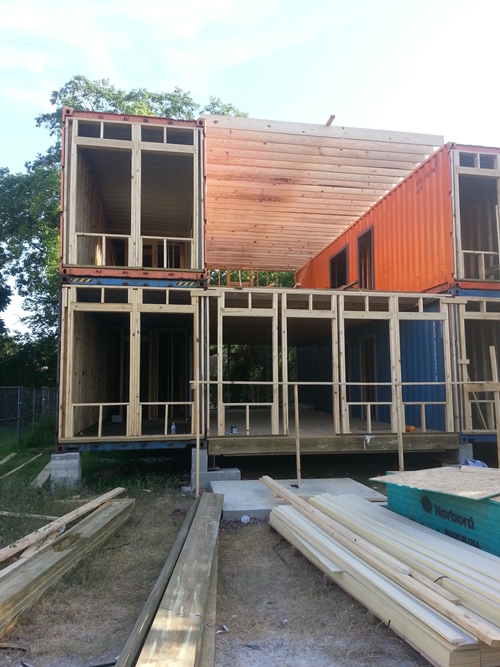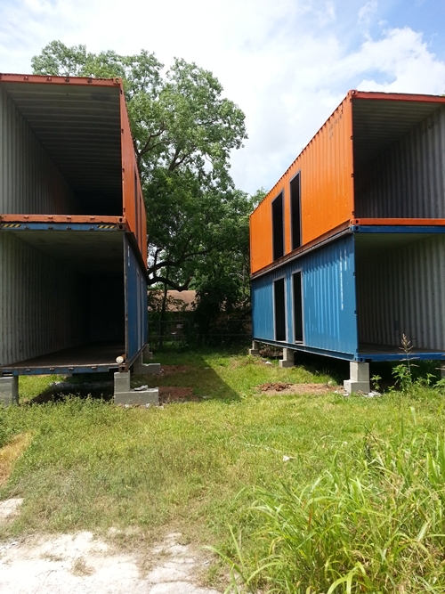 เมื่อเคลียร์พื้นที่เรียบร้อยแล้ว ก็เริ่มการจัดวางตู้คอนเทนเนอร์ โดยวางห่างกันสองด้าน ด้านละสองตู้
