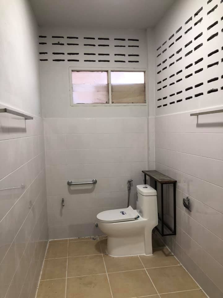 ห้องน้ำเองก็ถูกยกเครื่องใหม่เช่นกัน ทาสีใหม่ด้วยสีขาวทำให้ดูสว่างและโปร่งยิ่งขึ้น มาพร้อมกับผนังกั้นพื้นที่แห้งเปียก เพิ่มความะสะดวกในการทำความสะอาด