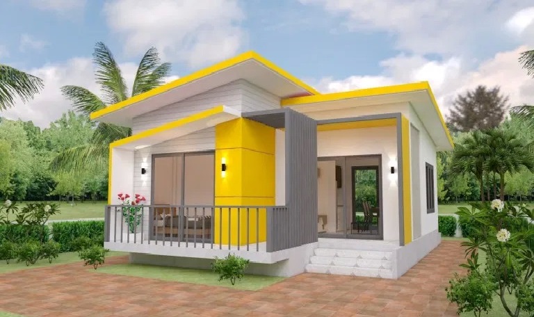 สำหรับแบบบ้านหลังนี้เป็นบ้านขนาดชั้นเดียว ตัวบ้านมีดีไซน์ที่เรียบง่ายในทรงสี่เหลี่ยม หลังคาออกแบบด้วยทรงเพิงหมาแหงน ผนังภายนอกตกแต่งด้วยสีขาวยืนพื้น แทรกไปด้วยโทนสีเหลืองสดใส ทำให้บ้านดูไม่จืดชืดจนเกินไป