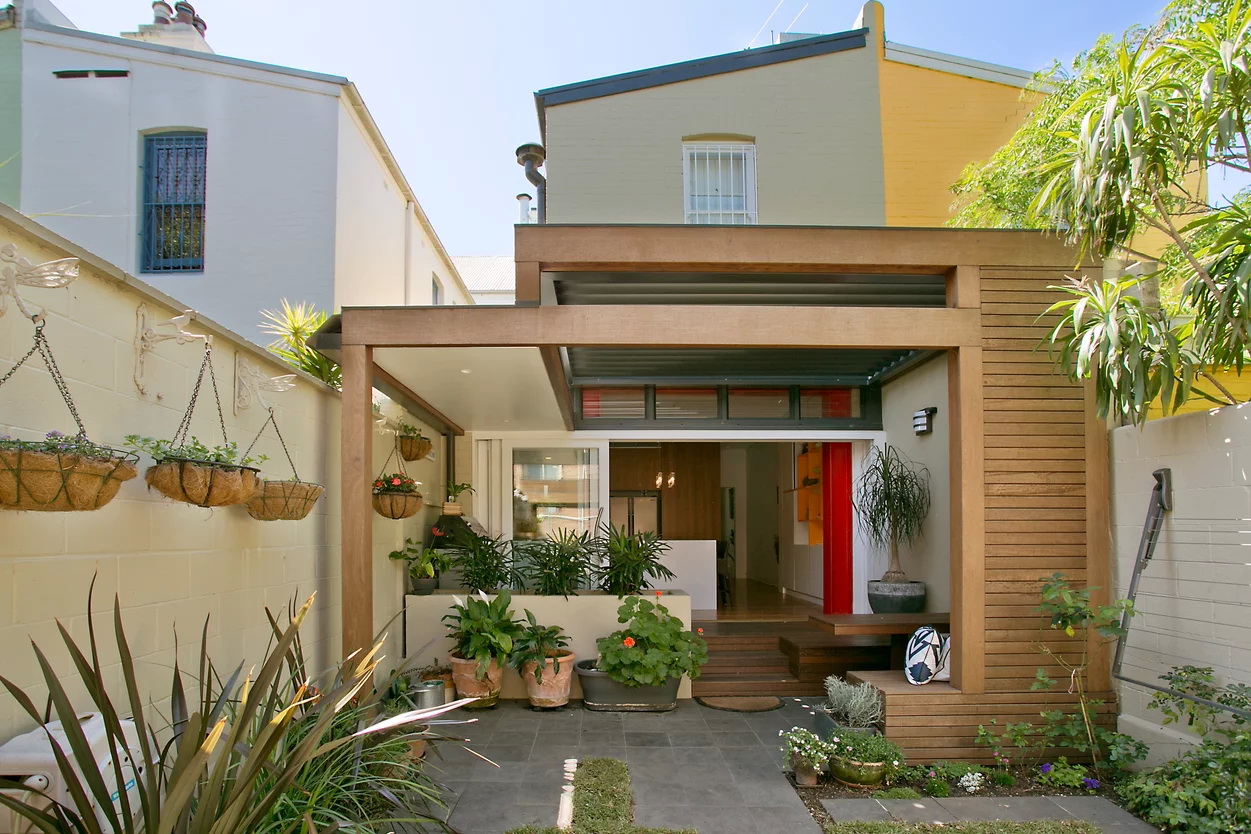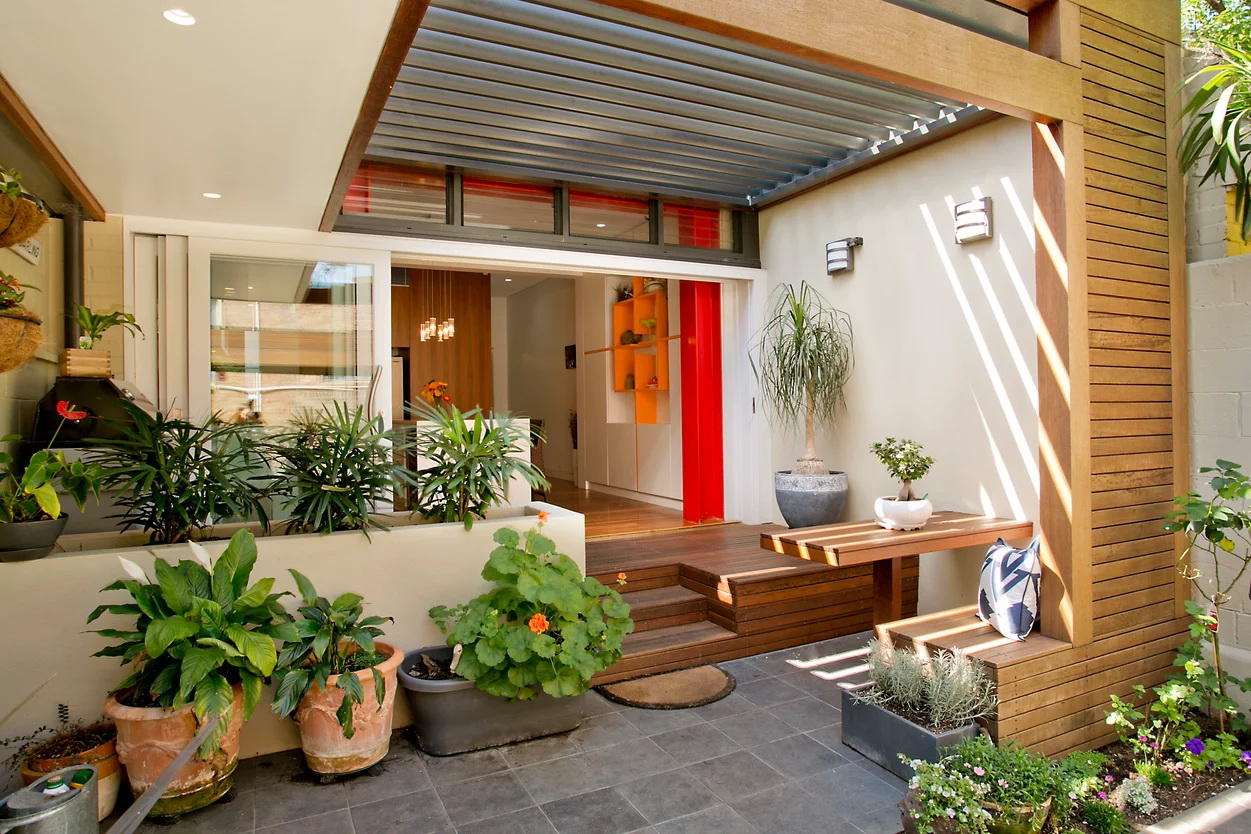 เฉลียงหน้าบ้านถูกตกแต่งให้เป็นมุมพักผ่อนที่สดชื่นด้วยการปลูกต้นไม้ขนาดต่าง ๆ เอาไว้ทั่วบริเวณ พร้อมกับออกแบบม้านั่งและโต๊ะที่มีเอกลักษณ์ไว้ให้นั่งพักผ่อนกันอีกด้วย