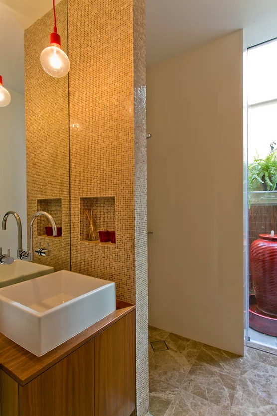 ภายในห้องน้ำจะมีการออกแบบพื้นที่แบบเรียบ ๆ แต่จุดที่สะดุดตาขึ้นมาเลย ก็จะเป็นผนังตรงนี้ที่ตกแต่งด้วยกระเบื้องชิ้นเล็ก ที่เล่นกับแสงไฟได้อย่างสวยงาม