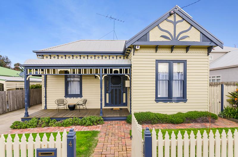 เริ่มจากด้านหน้าที่ล้อมรั้วเตี้ยๆสีครีมอ่อนๆ เช่นเดียวกันกับตัวบ้านไม้หลังคาทรงหน้าจั่ว ตัดขอบด้วยสีน้ำเงินเข้มดูสบายตา ด้านหน้ามีระเบียงนั่งเล่นพักผ่อนพร้อมกับกันสาด ที่มีลวดลายอย่างเป็นเอกลักษณ์ พร้อมกับรูปแบบศิลปะที่ดูวินเทจอยู่หน่อยๆ