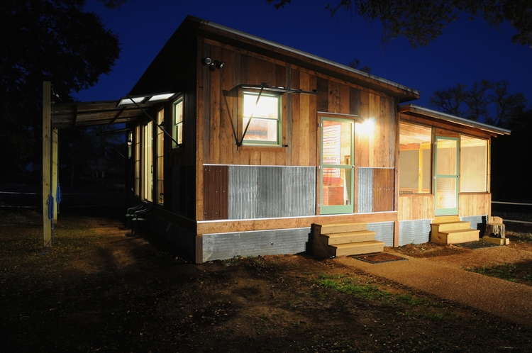 เราเห็นว่าบ้านเป็นบ้านไม้ชั้นเดียว ออกแบบโดดเด่นด้วยรูปทรงหลังคาลาดเอียงแบบเฉียงด้านข้าง โดยมีโรงจอดรถต่อออกมาข้างบ้าน ตัวบ้านแบ่งเป็นสองส่วนทั้งส่วนที่ดูทึบปิดด้วยไม้ กับส่วนที่เป็นห้องกระจกใสที่ค่อนข้างดูโล่งๆและโปร่งกว่า