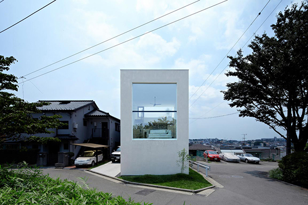 เป็นตัวอย่างบ้านสามชั้นทรงสี่เหลี่ยม ออกแบบมาได้อย่างมีความโมเดิร์นทันสมัย มองจากภายนอกจะเห็นเป็นเพียงกล่องที่ติดกระจกเอาไว้ โดยมีประโยชน์ให้แสงส่องเข้าไปให้บ้านหลังเล็กนี้ดูกว้างขึ้น