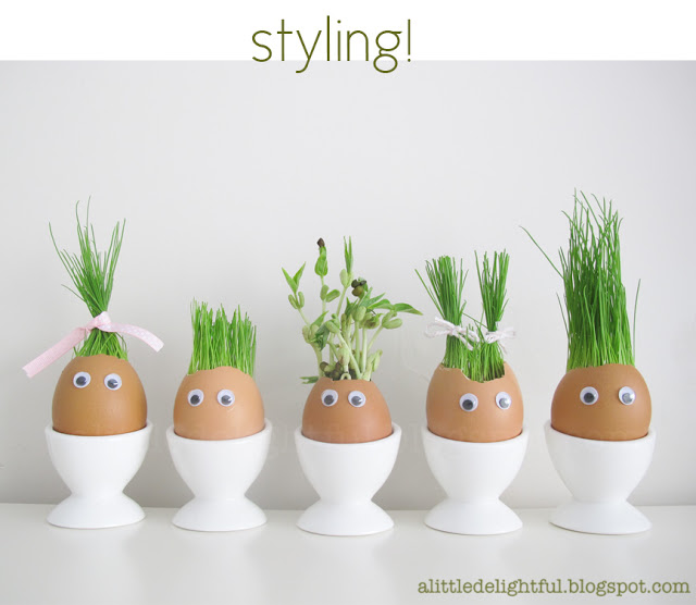 พอผ่านไปสักอาทิตย์หนึ่ง เราก็ย้ายจากแปลงปลูก (รางใส่ไข่แบบธรรมดาๆ) ไปตั้งไว้ในภาชนะที่สวยขึ้น รวมถึงตกแต่งไข่ให้น่ารักๆ ใส่ลูกตาใส่ปาก เขียนคิ้ว ปัดแก้มอะไรก็ว่าไปแล้วแต่จินตนาการเลยครับ ก็ได้ของแต่งบ้านเก๋ๆมาแล้ว…