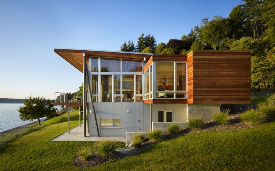 สวัสดีครับ วันนี้ผมไปเจอแบบบ้านริมน้ำที่น่าสนใจจากสหรัฐอเมริกา ตั้งอยู่บนพื้นที่ริมตลิ่งลาดลงไป เพราะฉะนั้นสภาพพื้นจึงไม่ราบเรียบ แต่บ้านก็ออกแบบให้ตั้งอยู่บนพื้นที่แบบนี้ได้อย่างดี ผลงานการออกแบบโดย Vandeventer + Carlander Architects