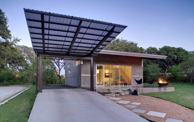 คราวนี้เอาใจคนชอบบ้านปูนเปลือย ด้วยภาพบ้านขนาดเล็กพร้อมกับโรงจอดรถที่ออกแบบได้อย่างสวยงาม ตัวบ้านทรงเพิงหมาแหงนภายนอกใช้ปูนเปลือย ให้ความรู้สึกหนักแน่นมีพลัง แต่ลดความแข็งกระด้างด้วยประตูเลื่อนกระจกใส