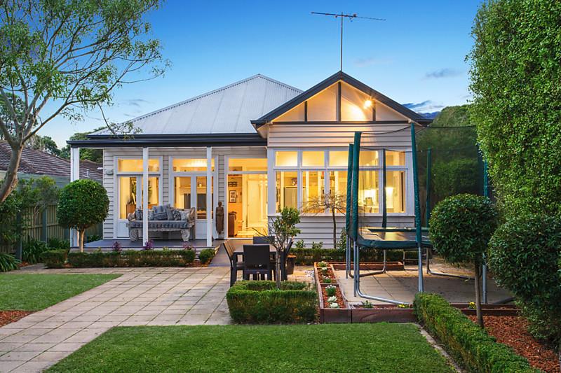 ตัวอย่างบ้านชั้นเดียว ซึ่งตั้งล้อมรอบด้วยบรรยากาศสีเขียวของสวนสวยๆ จัดเป็นสนามหญ้าและปลูกไม้พุ่มตกแต่งเพื่อความสวยงามลงตัว ตัวบ้านออกแบบทรงหน้าจั่ว มีระเบียงไม้ด้านหน้ายื่นออกมา และติดกระจกใสดูโล่งตา