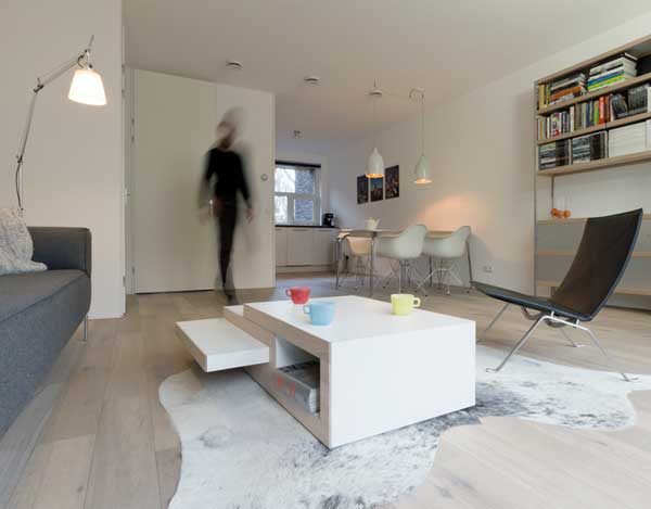 เฟอร์นิเจอร์ที่ประหยัดพื้นที่จึงเป็นทางเลือกใหม่ ตัวอย่างเช่นโต๊ะกาแฟตัวนี้ ซึ่งเมื่อเก็บพับทุกส่วนเข้าไปจะเห็นเป็นเพียงแค่โต๊ะไม้ธรรมดาเท่านั้น ขนาดเพียงแค่ 60×80 ซม. เท่านั้น แต่จะใช้งานได้มากขึ้นเมื่อดึงส่วนต่างๆออกมา