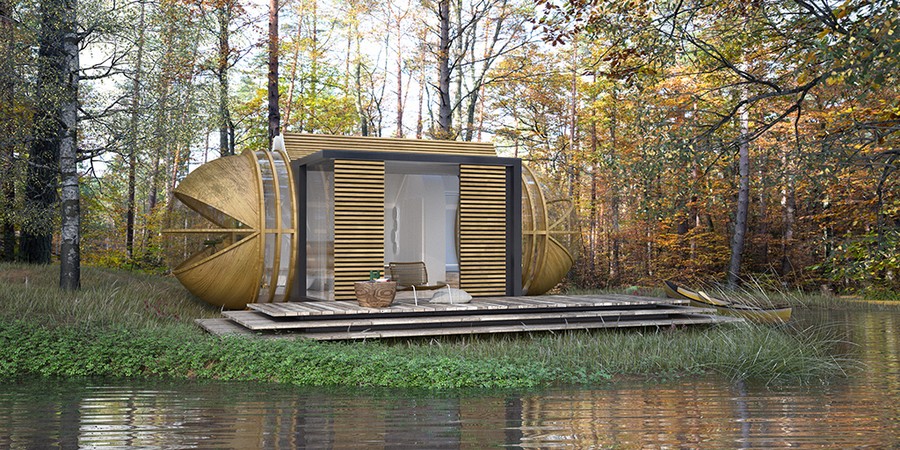 ตัวบ้านออกแบบเป็นรูปทรงคล้ายกับแคปซูล พร้อมส่วนหัวและท้ายที่โค้งมน ตกแต่งผสมผสานกับไม้และกระจกให้เกิดความทันสมัย โดยที่ภายในออกแบบให้ใช้งานได้ครบครัน ภายในพื้นที่ 30 ตร.ม. มีทั้งส่วนห้องนอน ห้องน้ำ ห้องนั่งเล่นภายในและตรงระเบียงด้านนอก (ในตัวอย่างขาดเพียงครัว ซึ่งถ้าติดตั้งให้ครบครันคงสมบูรณ์ทีเดียว)