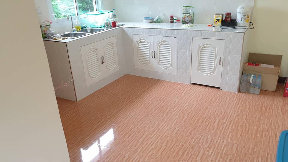 ภายในห้องครัวเลือกใช้วัสดุและองค์ประกอบที่เรียบง่าย แต่ก็สามารถใช้งานได้ดี บรรยากาศภายในครัวก็ยังคงมีความสว่างสบาย
