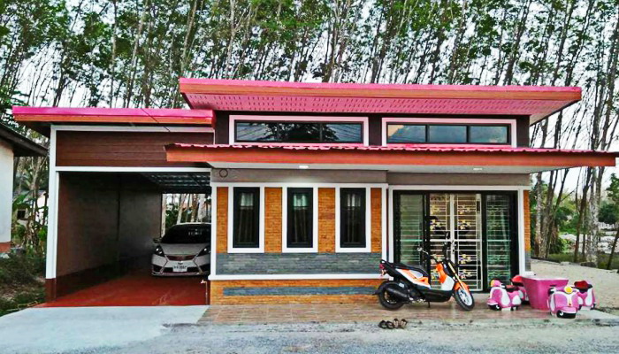 ลักษณะเป็นบ้านชั้นเดียวขนาดพอเหมาะ โครงสร้างคอนกรีตเสริมเหล็ก ผนังภายนอกกรุแต่งด้วยกระเบื้องหินเทียมโทนสีอิฐแซมเทา ปกคลุมด้วยหลังคาทรงเพิงหมาแหงน พร้อติดตั้งช่องกระจกช่วยเปิดกระจายแสงเข้าสู่ตัวบ้าน พื้นที่ด้านข้างต่อเติมโรงจอดรถขนาดพอเหมาะ สามารถรองรับรถยนต์ได้จำนวน 3 คัน