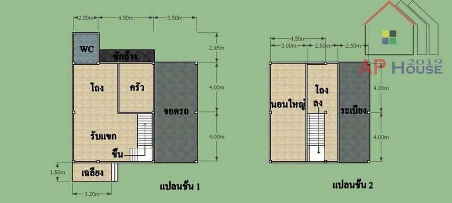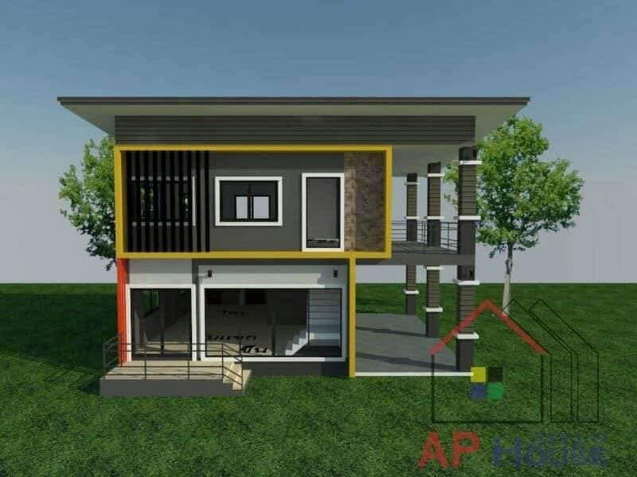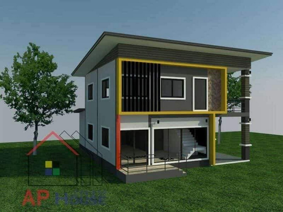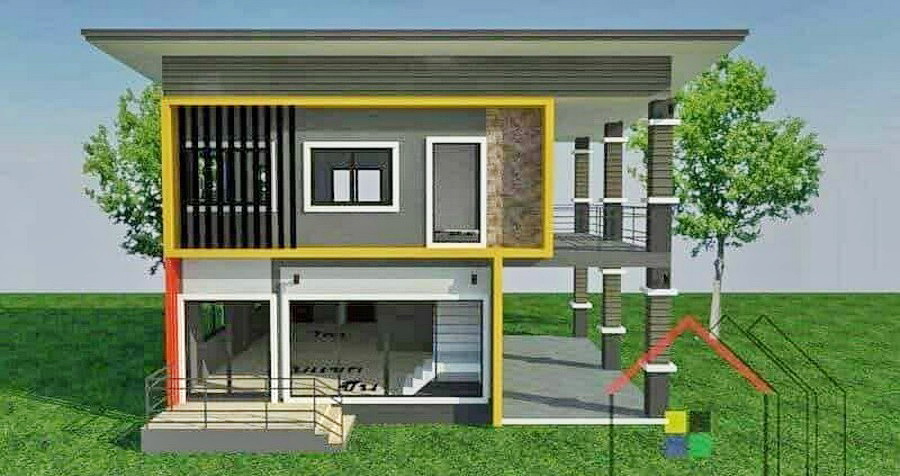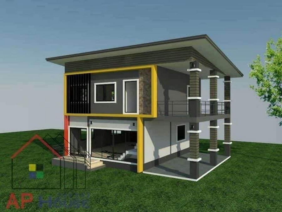 แบบบ้านสองชั้นสไตล์โมเดิร์น ออกแบบโถงกว้างชั้นล่าง พร้อมระเบียงชั้นบน 1 ห้องนอน 1 ห้องน้ำ