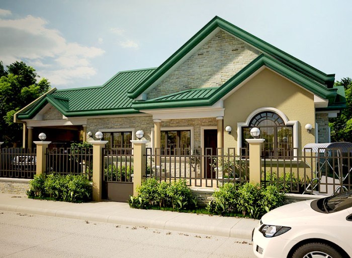 ตัวบ้านขนาดชั้นเดียว โครงสร้างทำจากคอนกรีต ผนังภายนอกฉาบปูนเรียบทาด้วยโทนสีน้ำตาลอ่อน ตัดกับหลังคาทรงจั่วมุงด้วยกระเบื้องสีเขียว สร้างจุดเด่นด้วยผนังลวดลายหินทราย กับดีไซน์หน้าต่างแบบโค้งมนเป็นจุดดึงสายตา