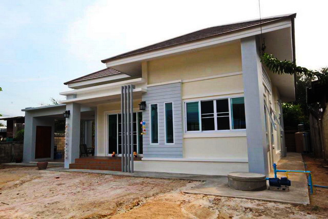 ลักษณะบ้านชั้นเดียวโครงสร้างปูน หลังคาทรงปั้นหยา ผนังภายนอกคลุมโทนสีขาว ตัดด้วยสีฟ้าและสีครีม ที่ด้านหน้ามีเฉลียงแคบๆ พร้อมด้วยพื้นที่นั่งเล่นใต้ชายคาตรงด้านข้าง หน้าต่างและประตูใช้แบบกระจกบานเลื่อนเพื่อความสะดวกในการเปิด – ปิด