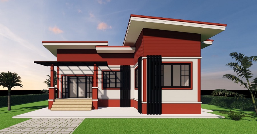 บ้านหลังนี้เป็นบ้านชั้นเดียวสไตล์โมเดิร์น หลังคาเพิงหมาแหงน ผนังภายนอกทาด้วยสีแดงและสีขาว ตัดกับระแนงเหล็กสีดำ รวมไปถึงสีเขียวของสนามหญ้า และต้นไม้โดยรอบ โดยรวมแล้วดูสวยงาม เข้ากันได้อย่างลงตัว