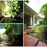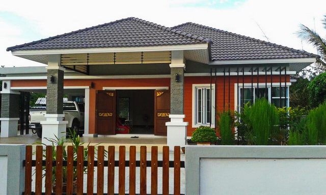 ลักษณะบ้านชั้นเดียวโครงสร้างปูน หลังคาทรงปั้นหยามุงกระเบื้องลอนสีเทา ผนังภายนอกมีการตกแต่งที่เป็นเอกลักษณ์ คุมโทนด้วยสีส้ม ขาว และเทา ผสานกลิ่นอายแบบทรอปิคอลด้วยเสาหินสีดำ เสริมแปลงต้นไม้ให้กลิ่นอายธรรมชาติ บวกกับเส้นสายที่เฉียบขาดแบบโมเดิร์น ดูจากภายนอกแล้ว สวยงามและดึงดูดทีเดียว