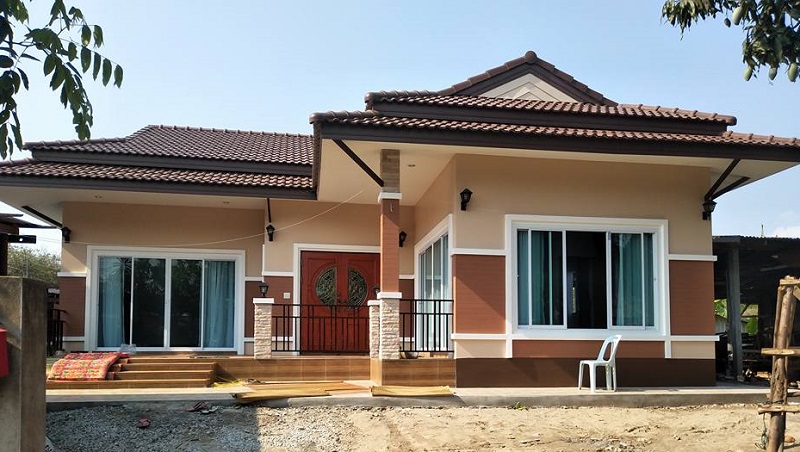 โครงสร้างบ้านเป็นคอนกรีตผสมเหล็ก ลักษณะตัวบ้านชั้นเดียวหลังคาทรงมะนิลา ผนังภายนอกตกแต่งด้วยโทนสีน้ำตาล แทรกไปด้วยผนังเซาะร่องโทนสีน้ำตาลเข้มสวยงาม