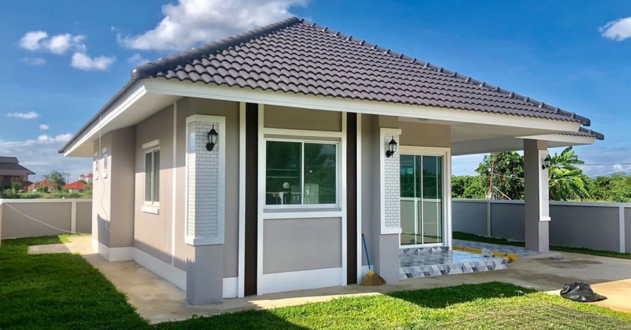 บ้านหลังนี้เป็นบ้านชั้นเดียวสไตล์คอนเทมโพรารี หลังคาทรงปั้นหยา ผนังด้านนอกทาด้วยโทนสีเทาแซมสีน้ำตาล ซึ่งเข้ากันได้ดีกับบัวปูนปั้นและวงกบประตูหน้าต่างสีขาว ดูเรียบง่าย แต่เพิ่มความสะดุดด้วยดีเทลเล็กๆ อย่างหินทราย และโคมไฟเล็กๆ ที่ใช้ตกแต่งเสานอกบ้าน