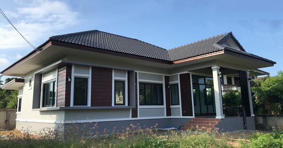 บ้านหลังนี้เป็นบ้านชั้นเดียวสไตล์ร่วมสมัยยกพื้นสูง หลังคาทรงปั้นหยา มุงด้วยกระเบื้องสีเทา ผนังบ้านตกแต่งด้วยบัวปูนปั้นและไม้ เพิ่มมิติให้บ้านดูสวยสะดุดตา หน้าบ้านมีเฉลียงให้ปูด้วยกระเบื้องลายไม้ ดูอบอุ่น เป็นกันเอง เชื้อเชิญแขกที่มาเยี่ยมบ้าน