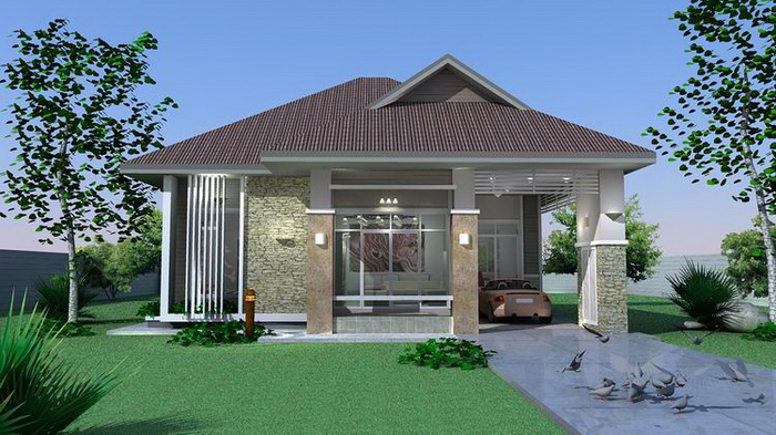 บริเวณทางเข้าบ้านมีระเบียง ก่อม้านั่งยึดผนังไว้สำหรับนั่งผักผ่อนรับลมธรรมชาติท่ามกลางสวนสีเขียวสด ส่วนอีกฝั่งหนึ่งปูลานกระเบื้อง จัดทำเป็นโรงจอดรถและเป็นพื้นที่พักผ่อนทำกิจกรรมนอกบ้าน