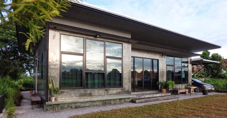 ตัวบ้านทรงหน้ากว้างขนาดชั้นเดียว หลังคาทรงเพิงหมาแหงนช่วยในการระบายน้ำฝนได้เป็นอย่างดี ผนังภายนอกตกแต่งด้วยปูนเปลือยขัดมันทั้งหมด