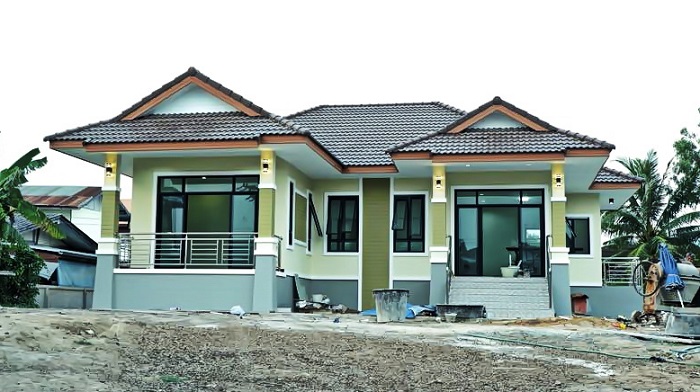 ตัวบ้านชั้นเดียวยกพื้น มุงหลังคาด้วยกระเบื้องลอนทรงมะนิลาผสมปั้นหยา ผนังภายนอกตกแต่งด้วยโทนสีเขียวเล่นระดับอ่อนเข้ม ฐานบ้านทาสีเทาตกแต่งเพิ่มความสวยงาม