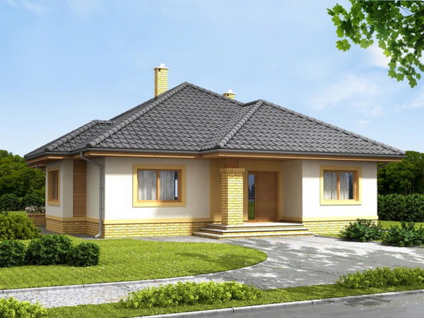 ตัวบ้านขนาดชั้นเดียว โครงสร้างทำจากคอนกรีต เลือกใช้หลังคาทรงปั้นหยามุงกระเบื้องลอนโทนสีเทา ผนังภายนอกฉาบปูนเรียบทาสีขาว แต่งฐานบ้านด้วยอิฐโชว์แนวสีเหลือง บริเวณทางเข้าด้านหน้ามาชานเล็กๆ ประดับด้วยเสาอิฐ นอกจากนี้ยังมีประตูออกไปสู่ด้านหลังด้วย