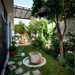 ตัวบ้านภายนอกทาผนังด้วยสีขาว หลังคาแบน เสริมความปลอดโปร่งให้ตัวบ้านด้วยหน้าต่าง – ประตูกระจกใส มีชานบ้านสำหรับนั่งเล่นด้านหน้า พร้อมทั้งสนามหญ้าสีเขียว เพิ่มความสดชื่นให้กับตัวบ้านเรียบๆได้เป็นอย่างดี