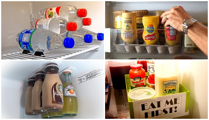 ขวดน้ำก็ถือเป็นบรรจุภัณฑ์ที่ค่อนข้างกินพื้นที่ในตู้เย็นมากทีเดียว บางขวดก็มีขนาดเล็กใหญ่ไม่เท่ากัน ถ้าวางเรียงแถวก็อาจจะเกะกะอยู่ไม่น้อย แต่เราสามารถแก้ไขได้โดยการใช้คลิปดำมาหนีบไว้กับชั้นระแนง เพื่อป้องกันไม้ให้ขวดน้ำไหลกินพื้นที่โดยรอบ และยังสามารถวางน้ำขวดเล็กซ้อนทับได้ด้วยเช่นกัน